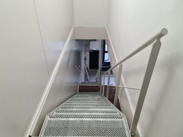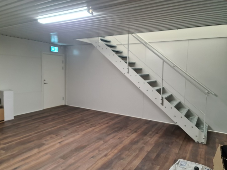 Uppdelad i tre plan, med verkstad i markplan, kontor högst upp och mellanplan för lager tex.